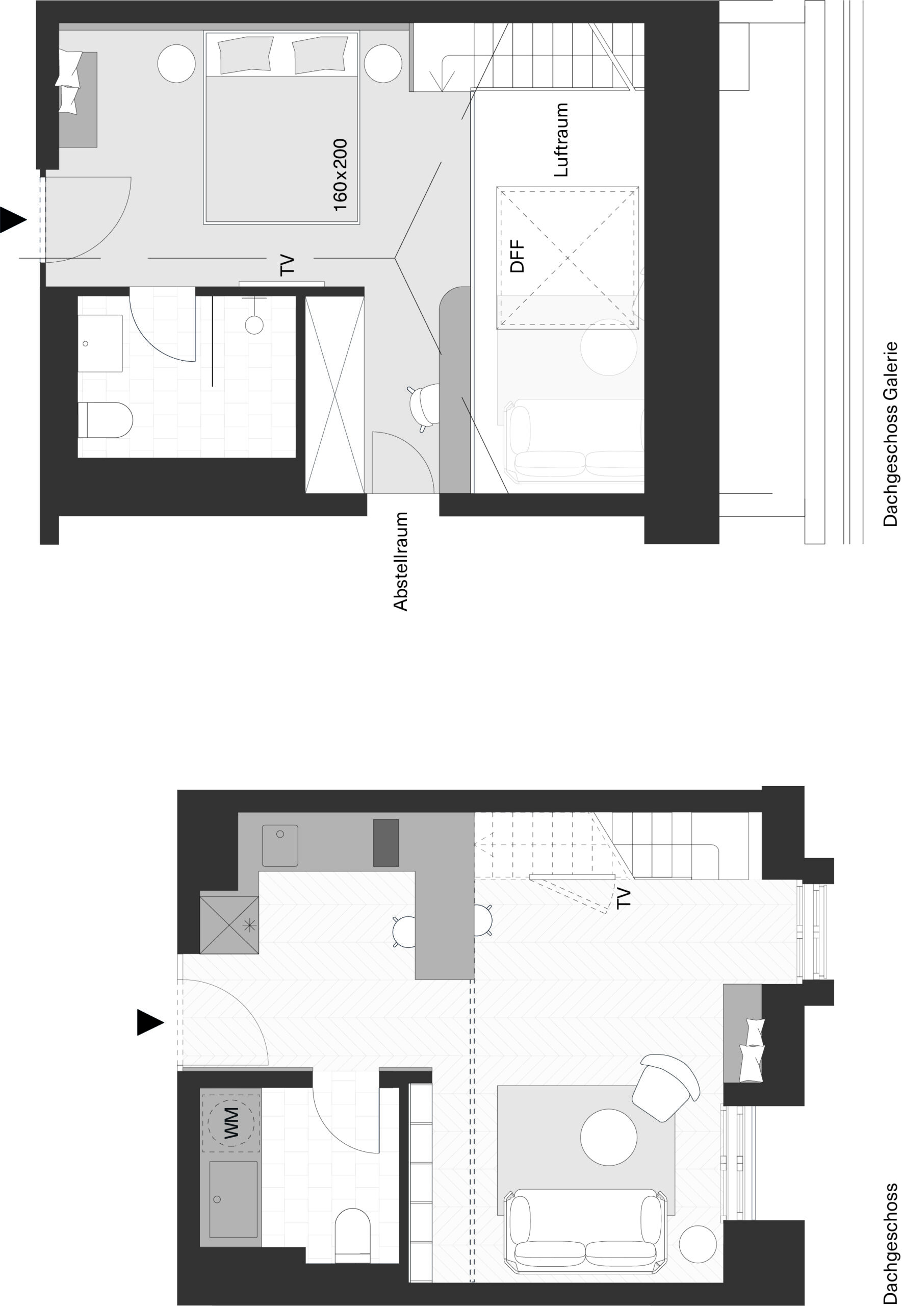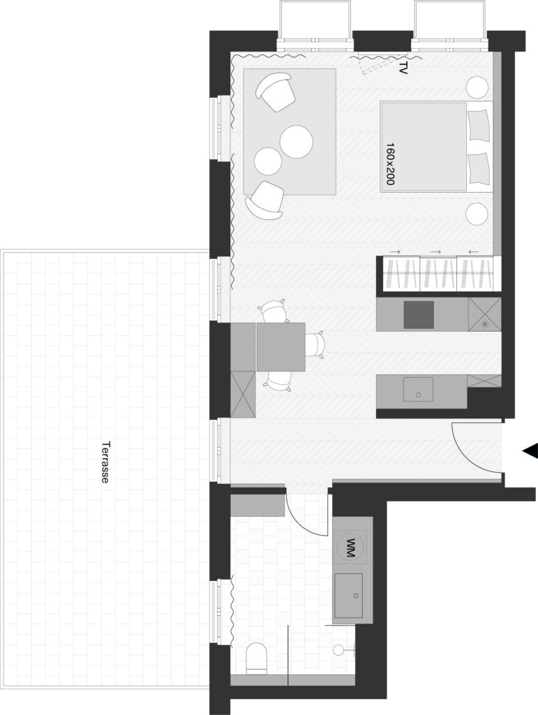 Raumhohe Einbauschränke, Vollholz-Eichenparkettböden sowie elegante Stahl- und Holzmöbel von Designern wie &Tradition, HAY und Manue vermitteln eine zurückhaltend-natürliche Farbigkeit. Feine Vorhangstoffe von Kvadrat sowie schwarz-weiße Bäder mit filigranen Armaturen des dänischen Herstellers Vola sorgen für eine harmonische Gestaltung und viel Raum für individuelles Wohnen.